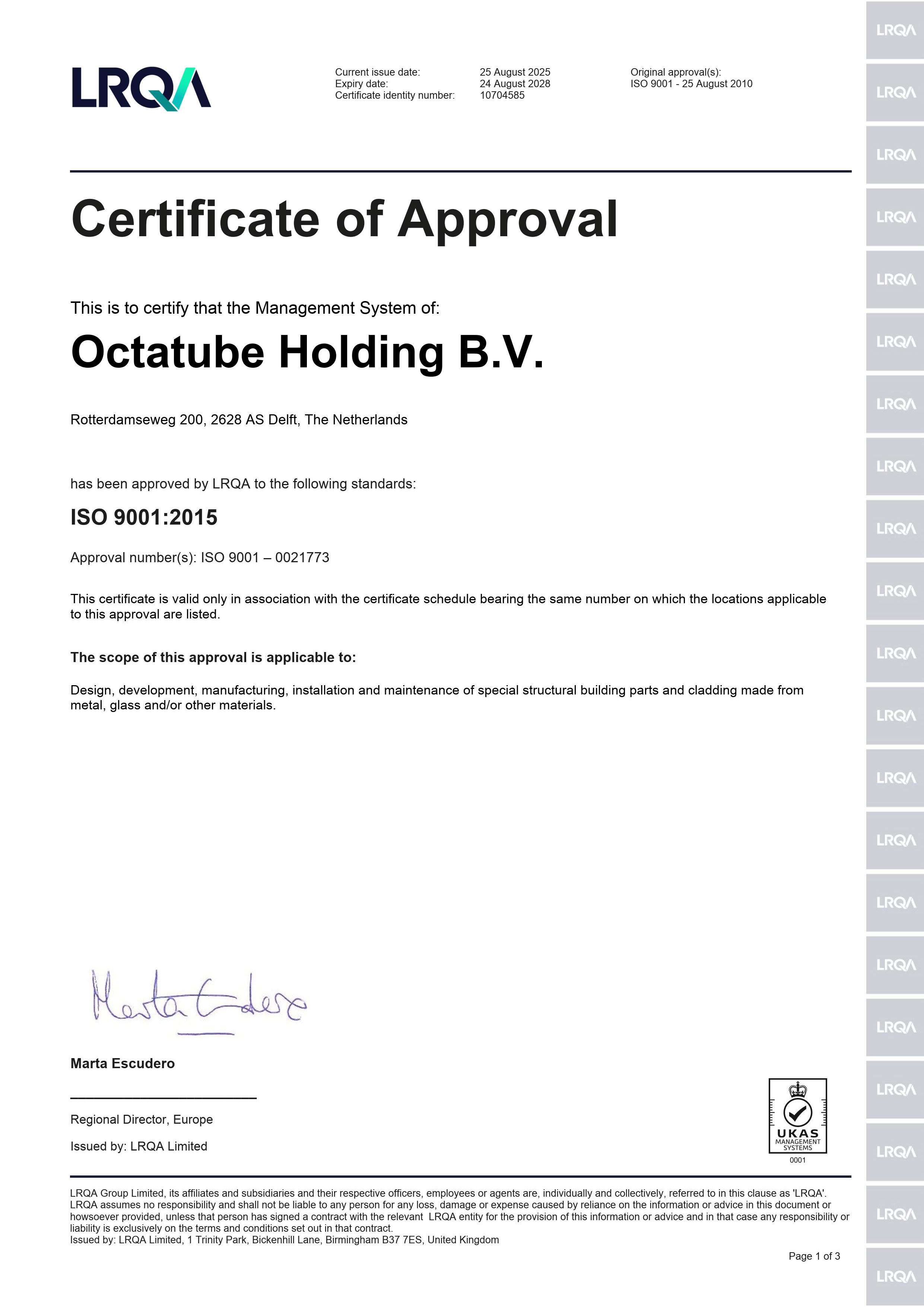 This norm represents the demands for our quality management system to raise our client satisfaction. With this certificate Octatube meets the requirements of customers and laws and regulations.