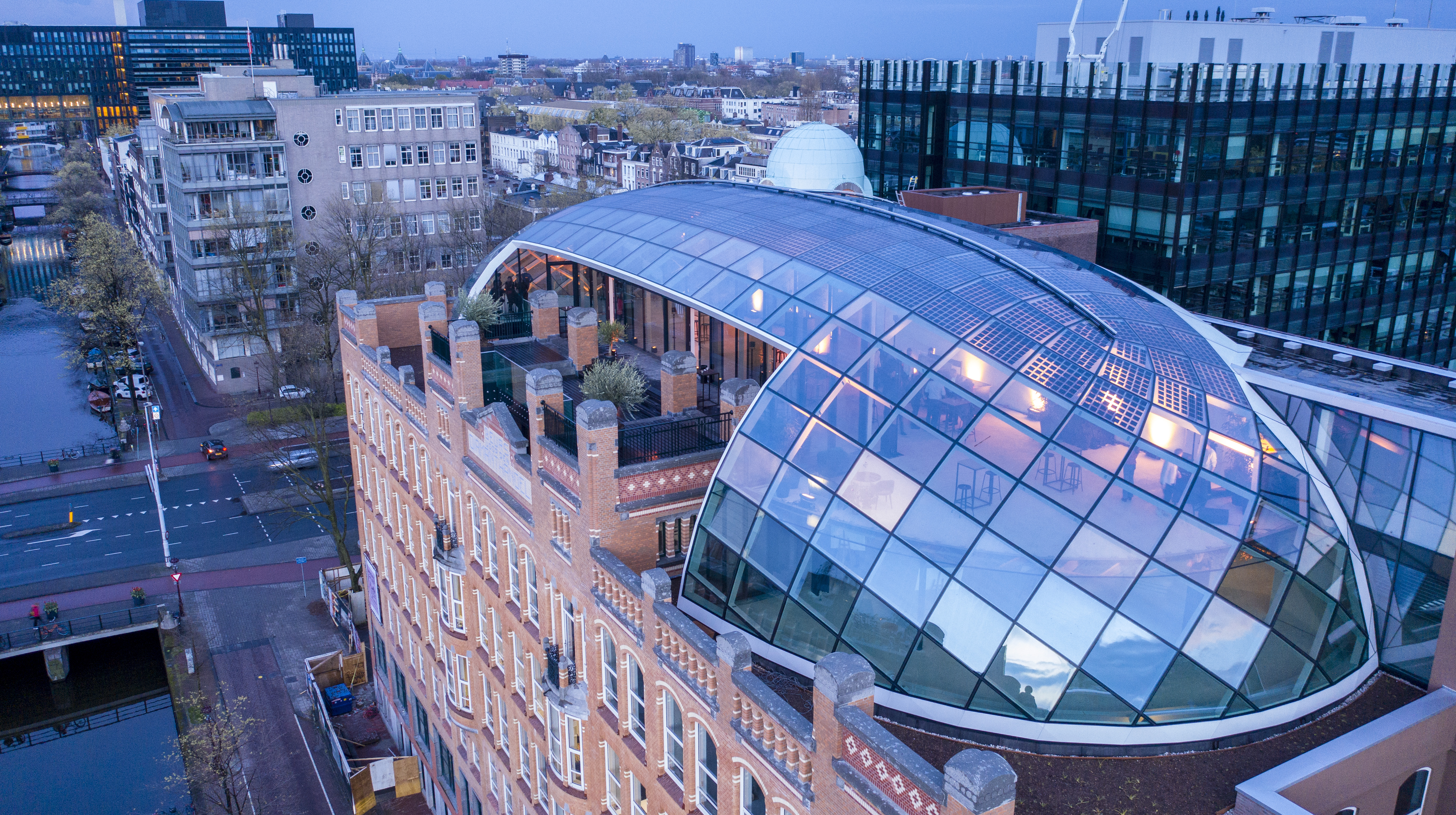 In 2019 this monumental building was entirely renovated, a design by Zwarts & Jansma Architecten, with a glass and steel rooftop construction as the highlight. This gridshell dome, consisting of two floors, can be associated with a facetted diamond – linking to the original purpose of the building, a Diamond Exchange.