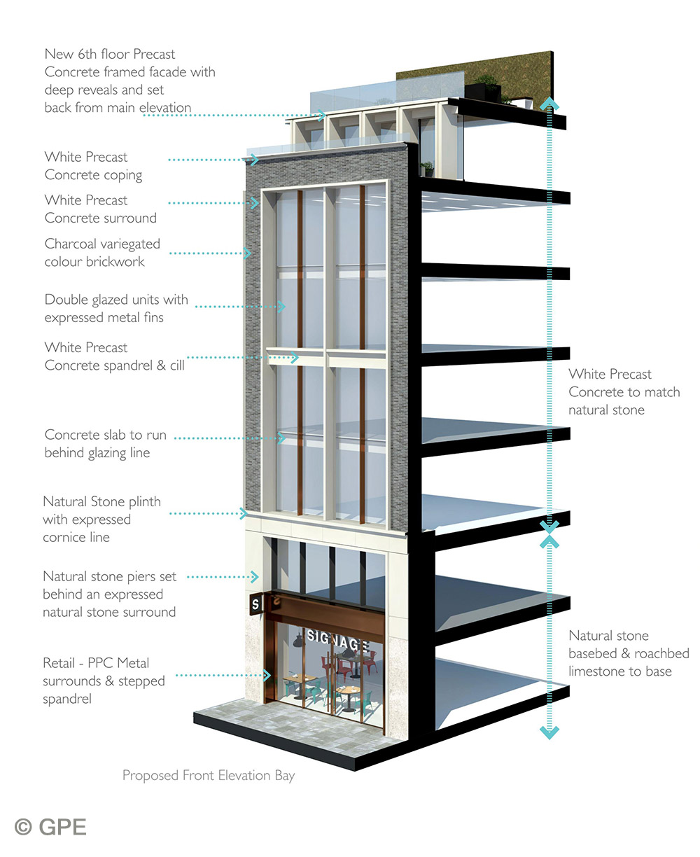 Commissioned by Wates Construction, Octatube has embarked on the engineering of the unique facade in which glass panels are framed by bronze anodised aluminium, and alternated with blinds, rainscreens and bespoke GRC (Glass fiber Reinforced Concrete) panels. The project is also featured with 13 bespoke glass and aluminium doors, and a 4.3 meters tall glass tourniquet. The architectural design is by Buckley Gray Yeoman.