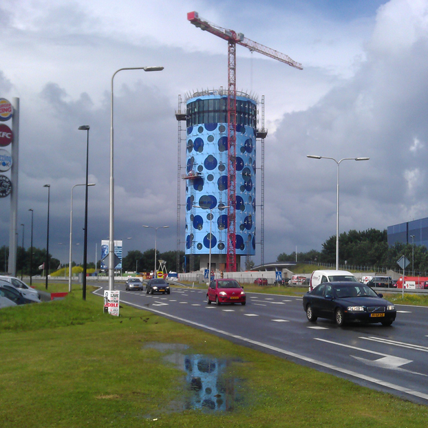 Today the installation of the second skin of the Flether Hotel at the A2 highway in Amsterdam has started off. The glass of the second skin has - just like the first GRP skin - a pattern of blue dots. All glass panels have been bent cylindrically.