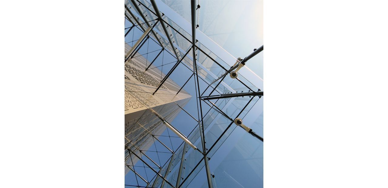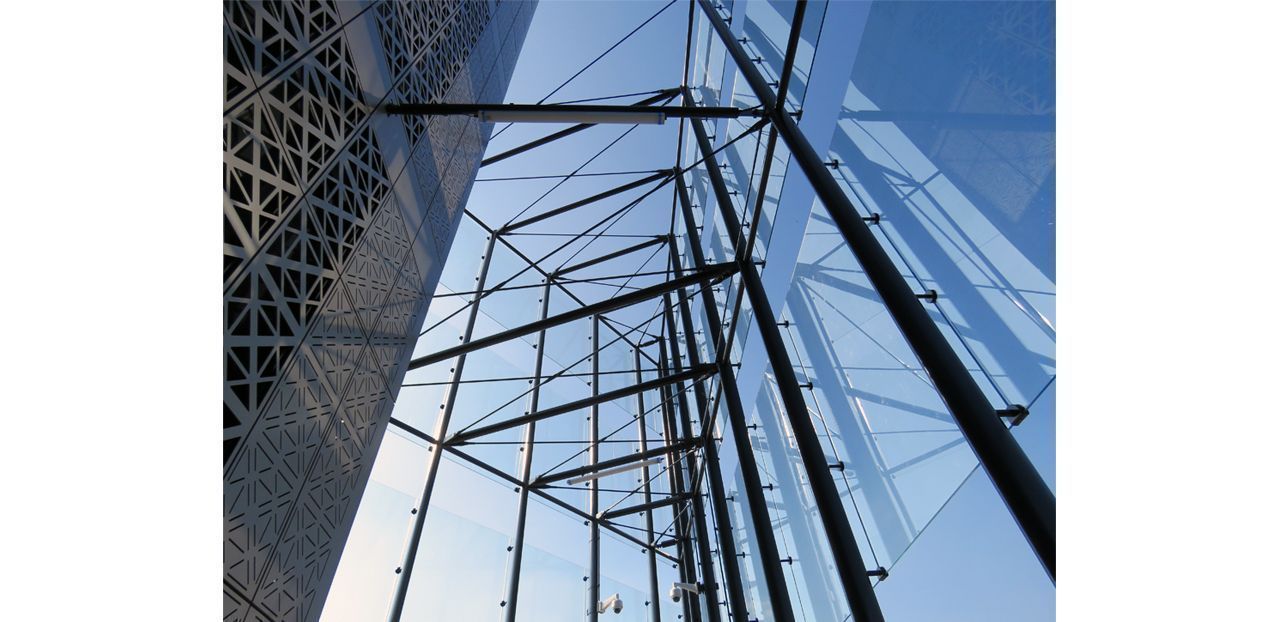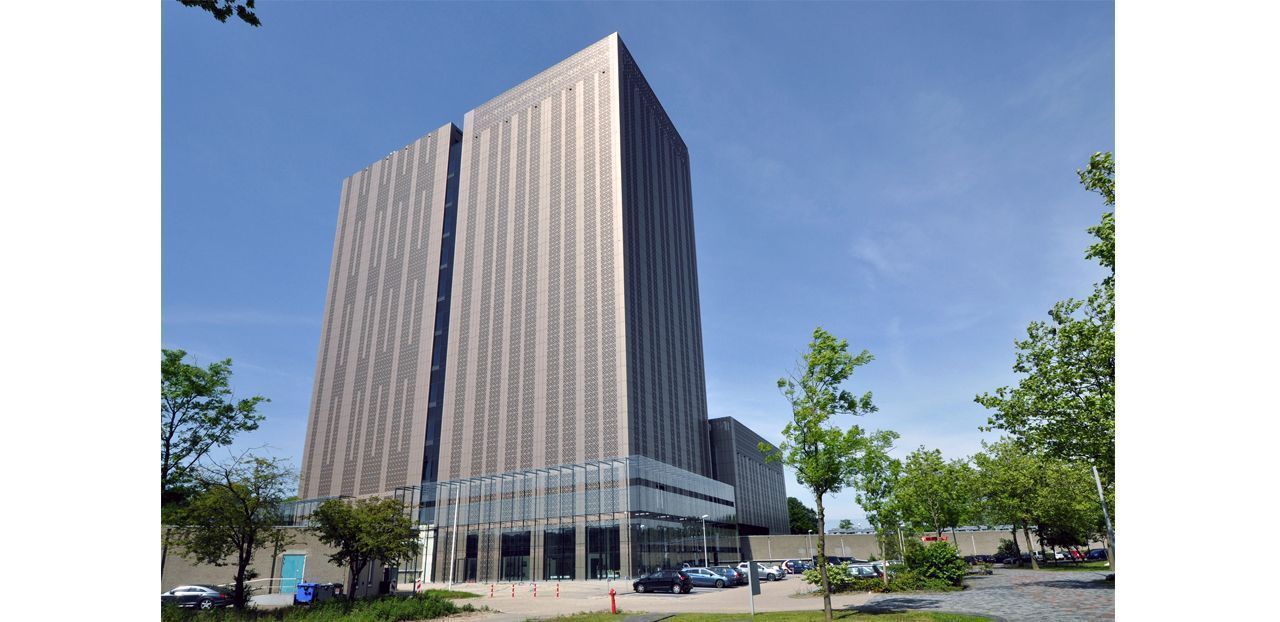 Architecturally, the glass façade provides a plinth to the high-rise building. The glass frontage marks the entrance space and functions as an extra security barrier. The hook-shaped steel structure is composed of elliptical hollow sections positioned at two-and-a-half meter distance from the main building’s façade which is clad in aluminium. The choice for elliptical tubes was made deliberately due to the profile's slenderness and has significant advantages taking up horizontal wind loads. The steel structure is cladded with safety glass (over 500 glass units) secured with clamping plates specially designed for this project. For entering the building, the glass façade is provided with a sliding door, a bespoke large sliding door as a goods entrance and three regular doors.