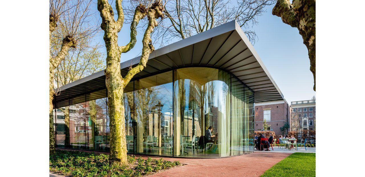 In the courtyard garden next to the Hermitage Museum in Amsterdam a teahouse has opened its doors in April 2014. The new pavilion has a wood structure and a full height glass facade running around the building. Hot bent glass panels at the corners provide an unobstructed view into the urban garden and incorporate the garden into the interior.