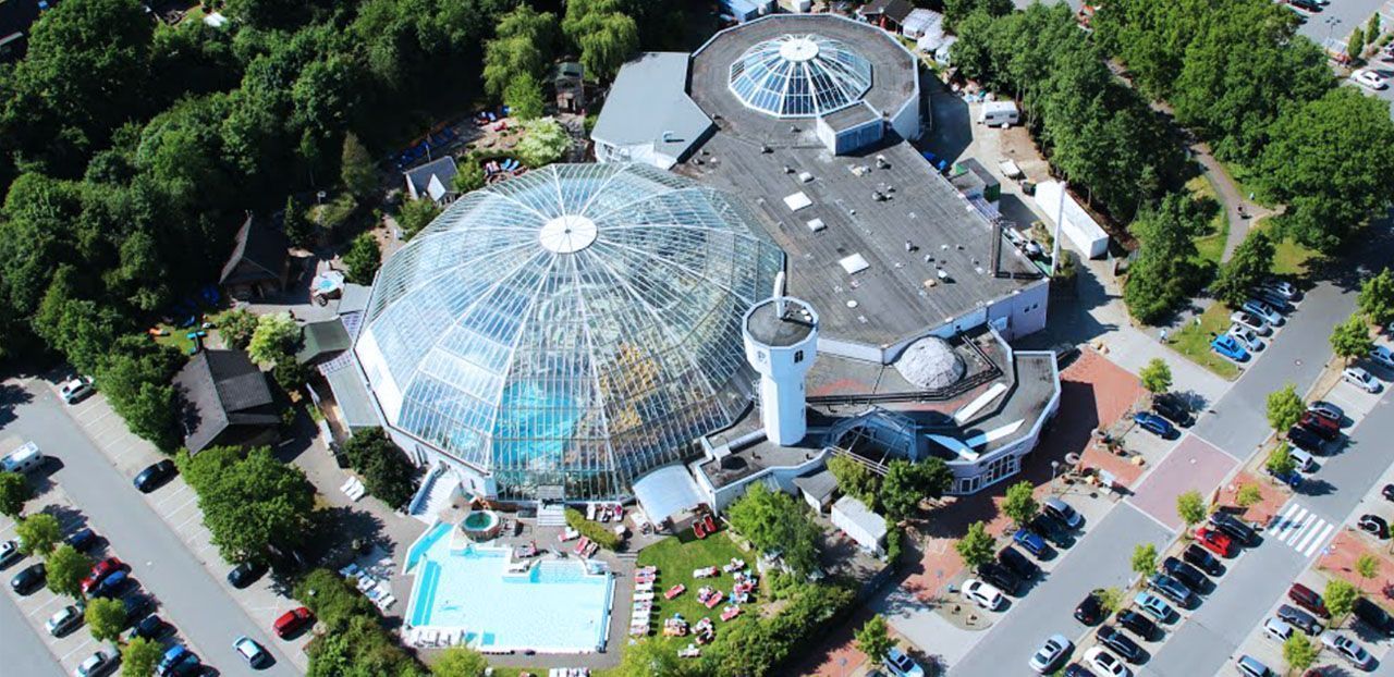 For a large dome covering a swimming pool a spaceframe in the Tuball system has been applied. The structure has a diameter of 50 meters, and a minimal geometry of intertwined delta beams. The steel spaceframe is galvanized and powdercoated, including the bolted connections. This has been done in order to prevent corrosion in the swimming pool environment. The construction has been cladded with insulated glass units, fixed on aluminium skylight profiles. In the centre of the dome emergency and ventilation hatches have been included.