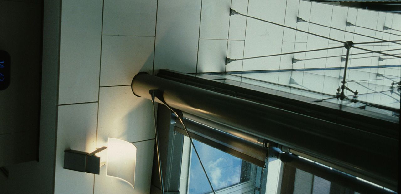 The weights of the lower roof, stairs and terraces are transferred to the concrete by means of tensile rods in the visible steel structure. The weights of the upper roof and the facade are carried by an integrated truss. Both roofs are subdivided in smaller parts, that each have a secundary structure of stainless steel tensile cables.