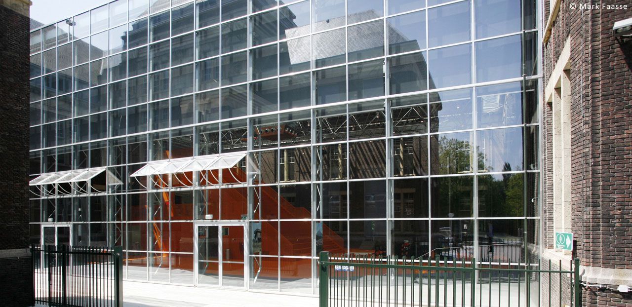 To enlarge the functionality and capacity, Octatube has added two lightweight and functional glass houses (+/- 2100m²), that could be engineered and built within a record time of only three months, because of the application of lightweight Octatube Tuball spaceframes. This system perfectly suited the required large span and free floor plan. The 3D steel spaceframe is based on spheres and rods on a grid of 2,7 meters by 2,7 meters. On three sides the glass walls and rooflights connect to the 19th century faculty building.
