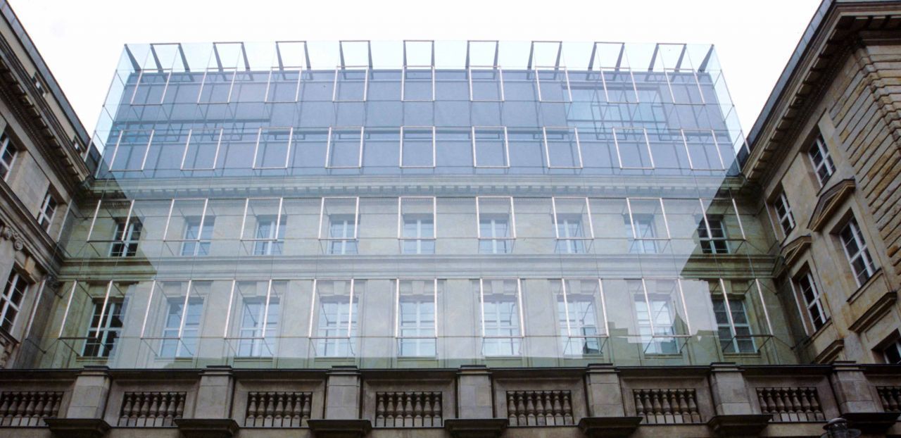 The double glass façade for the Deutsche Guggenheim (Unter den Linden, Berlin) was designed by architect Novotny & Mähner in order to smoothen out the difference between the existing stone façade and the new double steel/aluminum topping up by a reflection. The glazing was monolithic clear fully tempered glass with stainless steel frames as projections of the existing window scheme. The glass and profiles are suspended from brackets at the roof top.