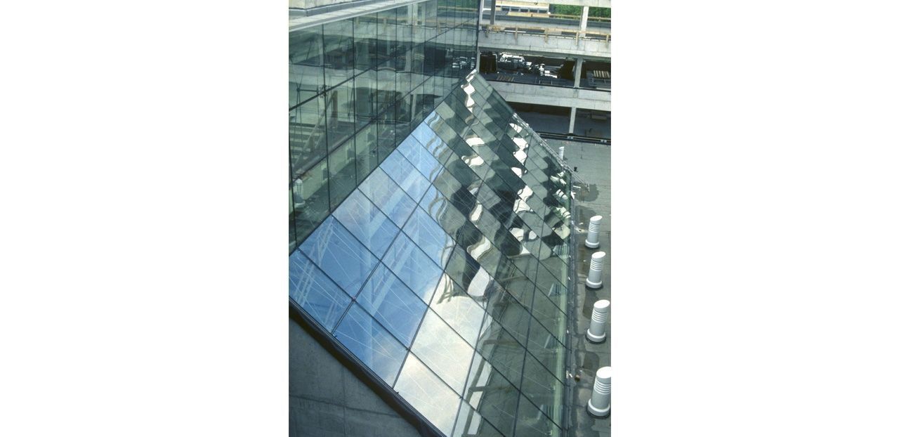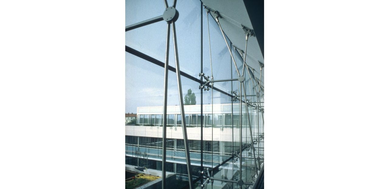 The atrium roof light is constructed of ultra light tensile trusses. Here, the double glass units are fixed with a structural bonding. This is the very first application of bonded connections of double glass units in Germany, by means of 'Zulassung im Einzelfall'.