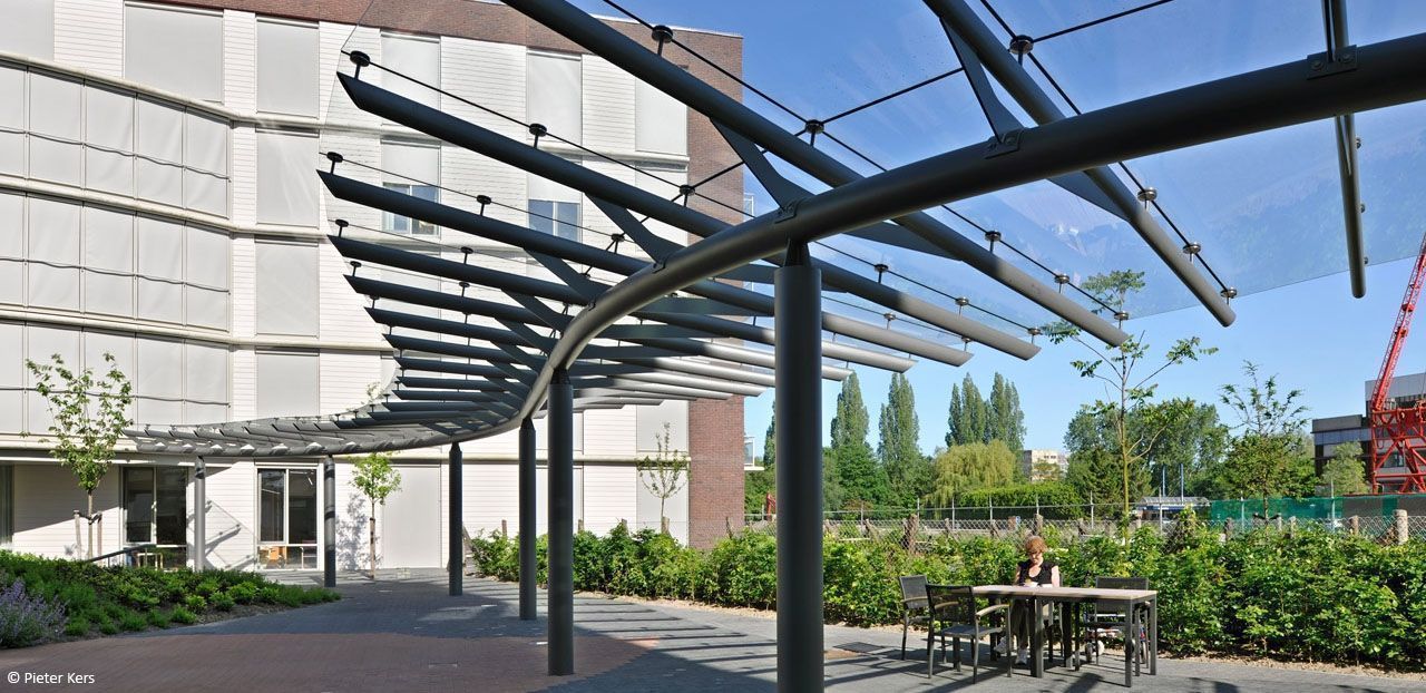 The back bone of the glass canopy consists of welded tubes that are connected to 10 columns. The secondary construction includes elliptical crossbeams that are twisted relatively to one another on the center of the welded tube. On this, toughened and laminated glass panels are fixed of 3.6 by 1.2 meters. These straight glass panels were clamped in their shape by means of circular clamping plates during installation. In total, a surface of 180 square meters has been covered by glass panels. Underneath the occupants and users can walk through the garden to the other side.