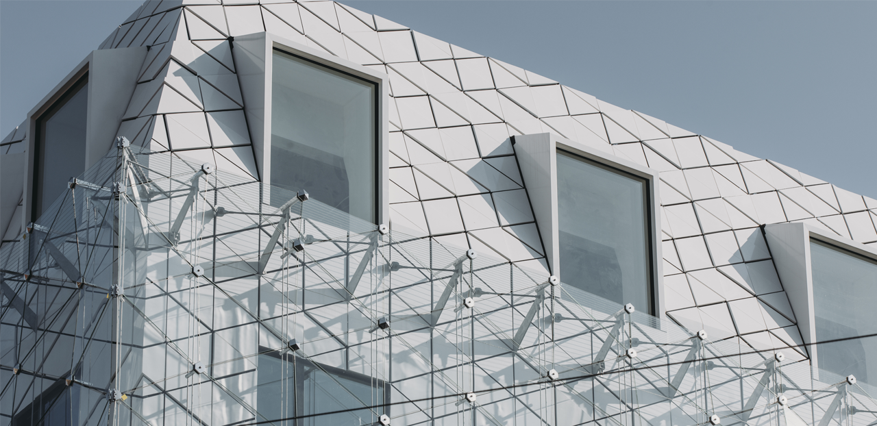 For this facade, we had specially developed elements made of plastic (pom) injection molded. We placed these elements in custom made stainless steel nodes. These nodes hold the more than 800 triangular laminated glass panels in a random distribution. The glass panels sometimes differ in size by only a few millimetres. We attached the nodes to the cables with stainless steel clamps.
