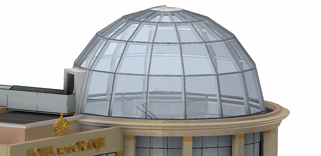 The leading five star hotel at the Koningin Wilhelmina Boulevard in Noordwijk aan Zee (Netherlands) is undergoing a large-scale renovation. Hotel van Oranje has become an icon over the past 40 years and is now being renovated from the ground up and in great detail. Two extra floors are added and the façade will get a totally new look with floor-to-ceiling windows and sliding doors to French balconies. An iconic new tower offers panoramic views over the boulevard, the beach and the sea and is topped off with the beautiful crown piece of this metamorphosis: an elegant, transparent glass dome.