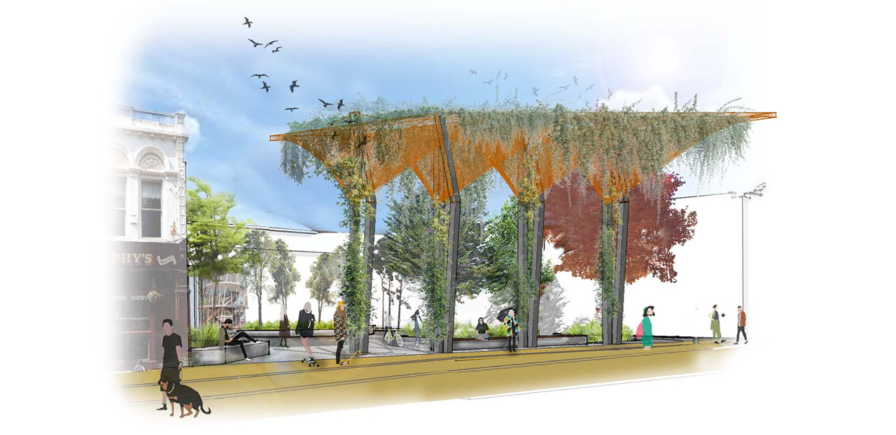 At the new Myrtle Square in the heart of Dún Laoghaire Town (in south Dublin), a bright yellow canopy made of wood and steel serves as landmark of this new public space providing a destination point and an attractive space for locals and visitors to linger and relax.