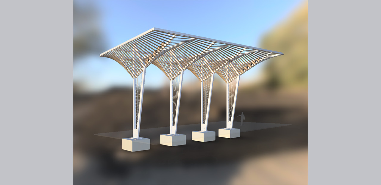 The canopy is 20 meters long, 10 meters wide, and 10 meters high. Four steel columns support the entire canopy. Each column consists of two beams which transfer the load of the roof to the concrete foundation. For stability, we welded the columns together to create a steel frame which we brought onsite as one welded assembly. In two of the columns we welden a steel mesh to allow climbing plants to grow up.