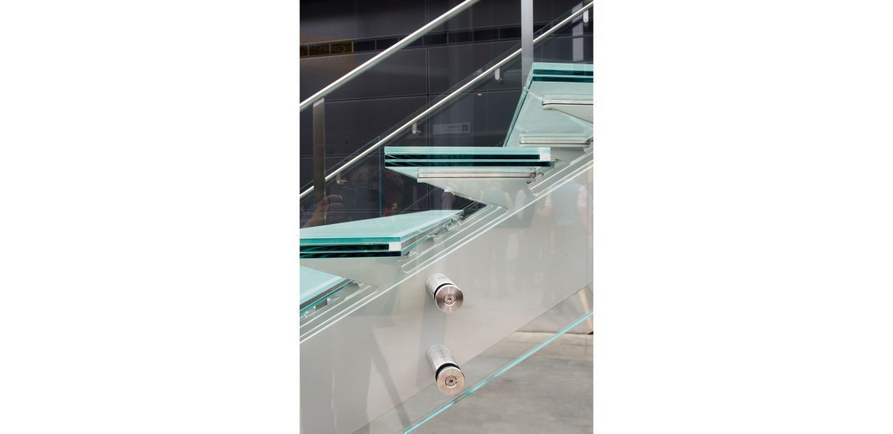 The entrance is marked by an 11-metre-long glass canopy that cantilevers 1.5 metres with a rigid connection of nearly half a metre. Inside the building stands a prominent glass staircase. This staircase rests on a triple-laminated glass arch and has LED lighting in the steps for a subtle evening accent.