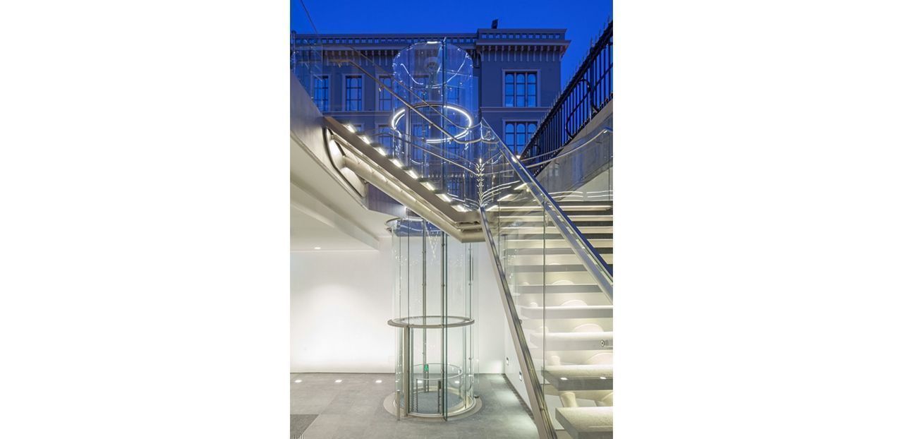 The cylinder is made of laminated heat strengthened hot bent glass, connected by horizontal stainless steel hoops. Vertical stabilization is ensured by three vertical glass fins connected at the top by a transom fin. The position of these glass fins is semi-inside the cylinder to create an abstract tubular appearance of the glass shaft being supported by bended glass units. Two of the three vertical glass fins act as the conducting rails of the sides of the glass elevator cage. The extreme high technical requirements of side tolerances (within 1 mm) of the elevator cage are met.