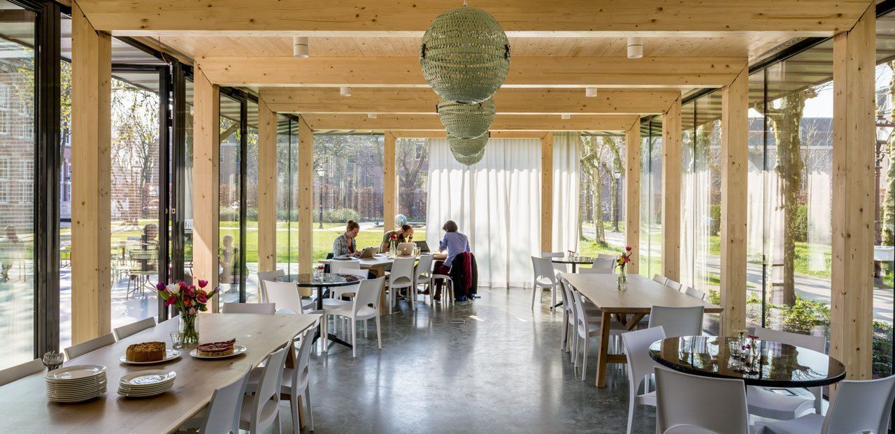 In the courtyard garden next to the Hermitage Museum in Amsterdam a teahouse has opened its doors in April 2014. The new pavilion has a wood structure and a full height glass facade running around the building. Hot bent glass panels at the corners provide an unobstructed view into the urban garden and incorporate the garden into the interior.