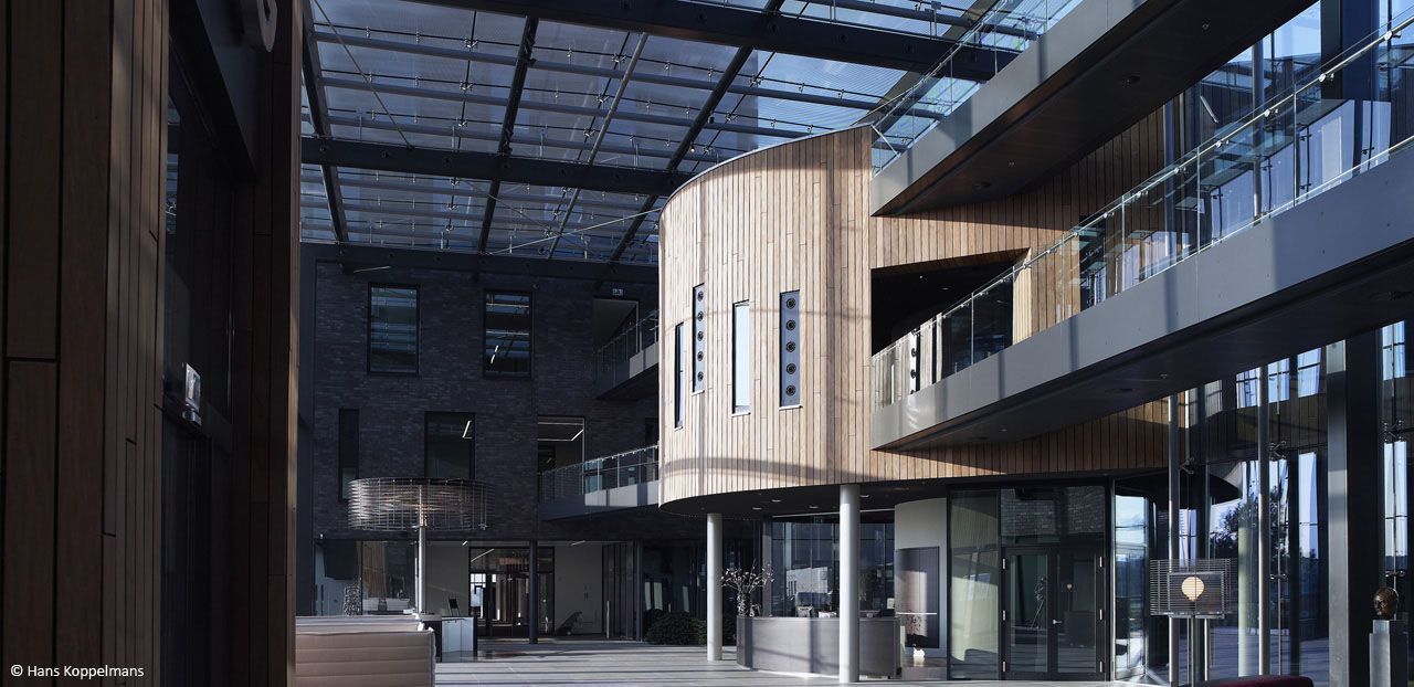 In the atrium are five large rectangular portals. From these portals, air is blown into the atrium. On top of the portals round tubes are placed that support elliptical shaped secondary steel portals. To keep an optimal transparency the outside corners are completely kept free from the supporting structure.