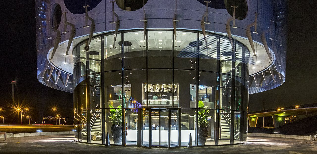 The technical composition of the double façade is as follows: steel brackets are fixed to the main concrete structure of the building, to which the prefab GRP elements are installed. To the GRP elements, steel swords are connected with Duo nodes at the ends. The laminated glass is point fixed to these nodes. The round windows integrated in the GRP elements are engineered in a double curved surface and consist of circular double glass units. By looking through these ‘portholes’ guests have a wide view. This new principle of the double skin façade has been tested with a mock-up prior to the production and installation.