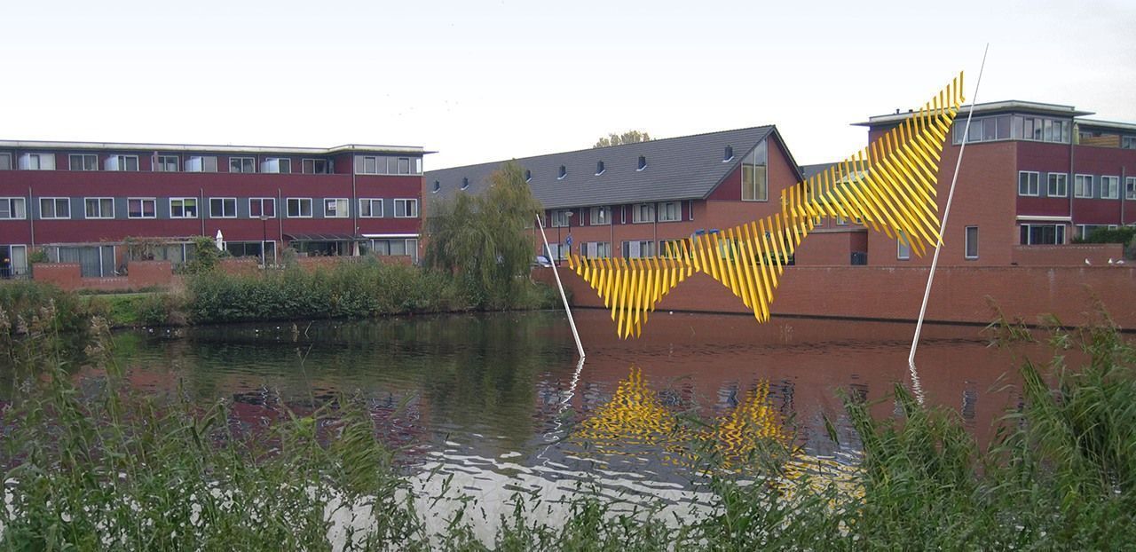 Meanwhile the new design has been realised. A yellow piece of art in the middle of the pond, named ‘Yellow Wings’. The result is a hovering artwork. The remake structure of the ‘Yellow Wings’ is placed as an insect on the water, just like its predecessor. It appears to be floating and contrasts with its surroundings. Happily against a dark background and comforting in dull weather.