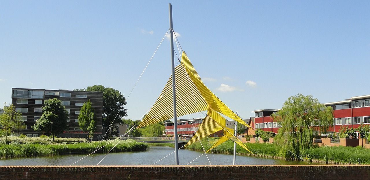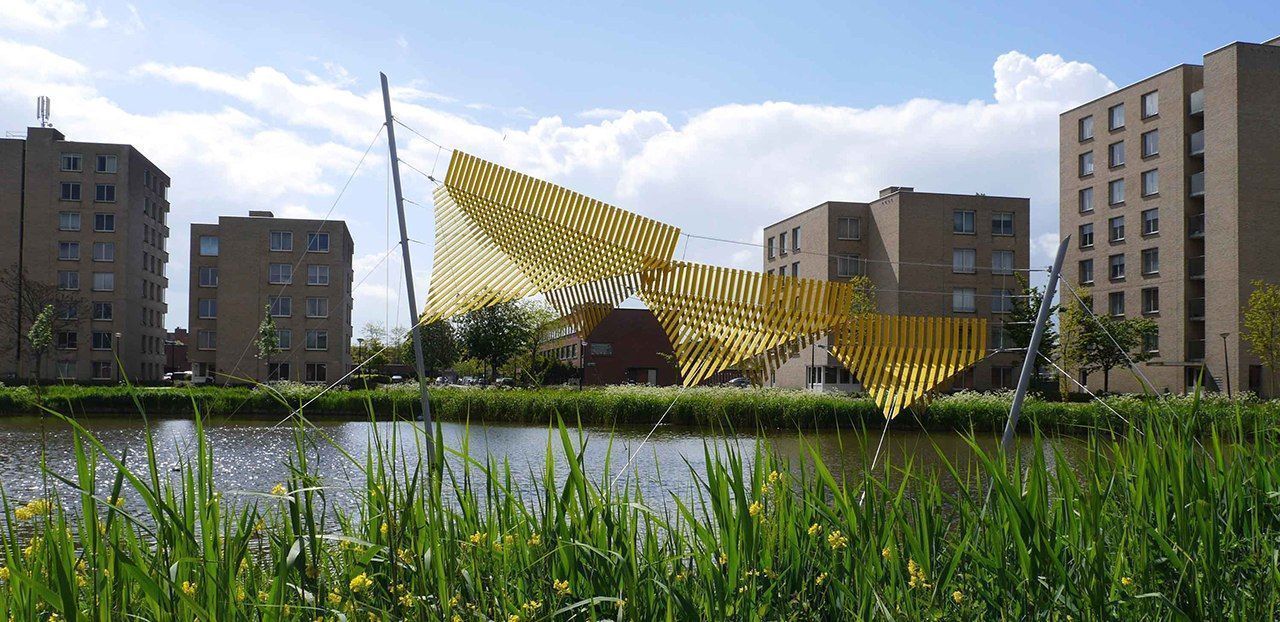 The artwork ‘Bijlmobiel’ – predecessor of the Yellow Wings - was conceptualized in March 1974 by artist Loes van der Horst and Mick Eekhout. After a process of design and engineering, the collaboration resulted in the realization of the ‘Bijlmobiel’ in 1976. A large piece of art, consisting of pylons, cables and six blue-white polypropylene cablenets.