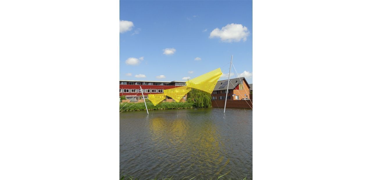 The aluminium strips are coloured yellow, contrasting with the red bricks of the houses surrounding the pond, and with the colour of the sky and the water. The artwork is situated in the central part of the pond.