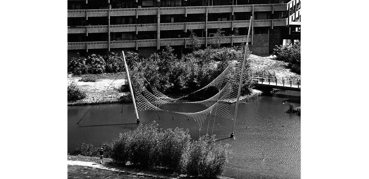 The artwork was built in a pool in Amsterdam’s Bijlmer district. It was an adventure to build it. A structure that presented itself like an enormous filigree insect on the water. After laying down the foundation in a drained pool, the steel pylons, cable works, cablenets and their tensioning was put in place. Construction proved to be a matter of specialism and dedication. The photo shows a very transparent light-weight artwork, measuring up to the tall flats of the Bijlmermeer: Fleerde and Frissentein.