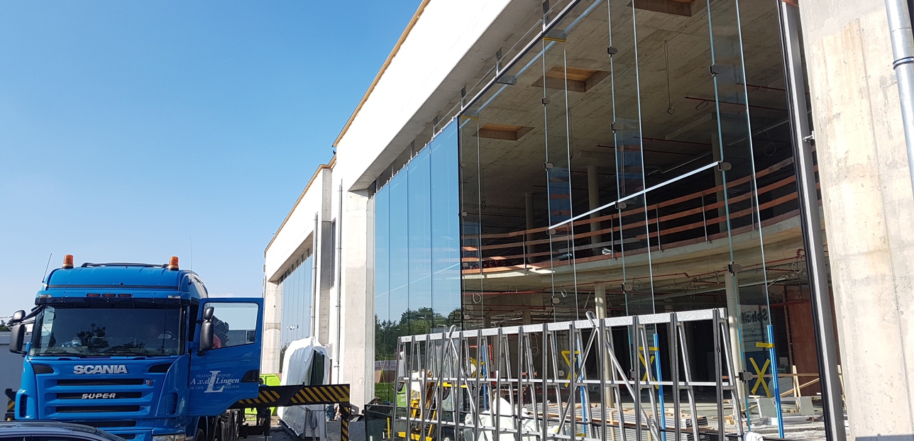 The glass panels weigh 1500 kg each and are 8.40x2.40. That's more than 18 m2 which is placed in one go. By measuring everything thoroughly in advance, we were able to assemble the complete facade in ten weeks.