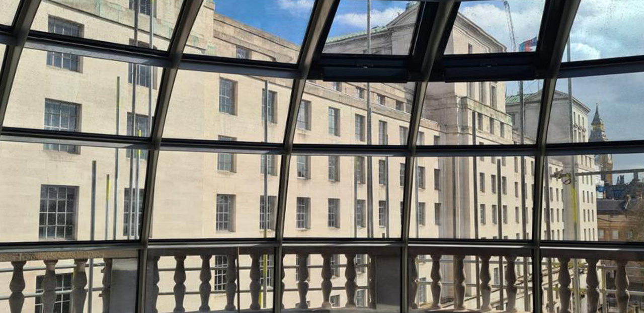A half-dome on the roof of the iconic Royal United Services Institute (RUSI) building in the heart of London provides a stunning meeting space with spectacular views over Whitehall Gardens and the Ministry of Defense. A striking feature of this glass dome is that the glass panels can be individually adjusted from almost entirely transparent to only 10% translucent.