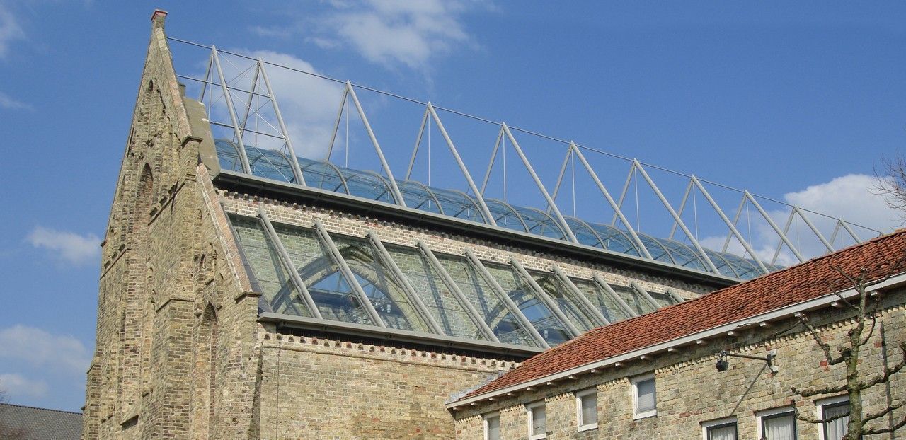 The ‘Broerekerk’ (church) in Bolsward (the Netherlands) is the oldest building of this city. It is built in the 13th century and it was owned by a monastic order. In May 1980 the building has burnt down. After a design competition (won by architect Jelle de Jong) it was renovated in 2006 and a glass roof was added to the old structure. Because the new glass roof of the church follows the original shape of the barrel vaults, the original experience of the interior space has delicately been restored.