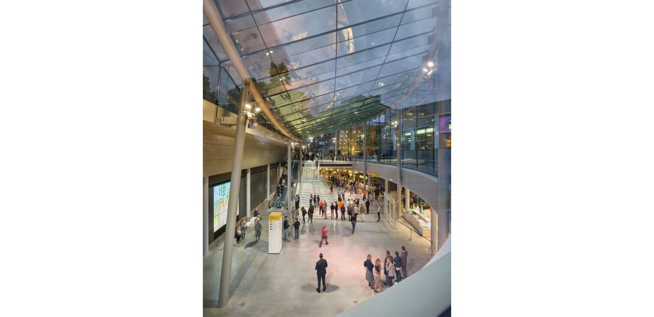 A double-curved glass roof, spanning 600 m², characterises the entrance building. The shape is an inverted version of the shell roof of the existing wing. The roof consists of insulated and laminated glass panels, each with a different width. Glass beams up to 12 metres long – the largest structural glass fins in the Netherlands – support the roof. These fins are triple-laminated with SentryGlas interlayers and not only bear the roof but also stabilise the underlying steel structure. The glass fins vary in length and height. A high-quality coating and a light screen print on the roof glass provide shading for the north-facing glass volume.