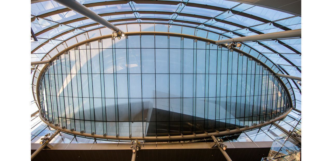 The curved glass façade consists of 650 m² of cold-bent double-glazed panels with a bending radius of up to 11.8 metres. These panels are attached to 20 unique glass fins. As with the roof, the fins are triple-laminated and feature SentryGlas interlayers. The longest façade fin is 9.4 metres. Cold bending glass in combination with structural fins proved not only technically feasible but also cost-efficient compared to hot-bent glass.