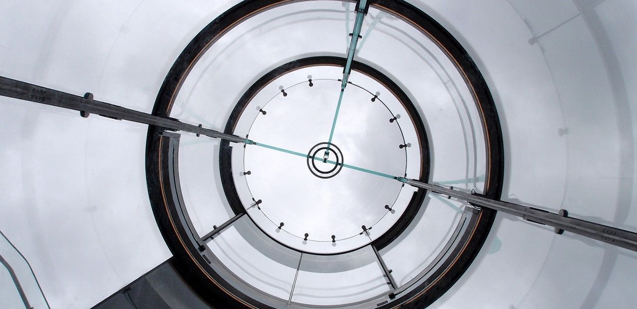 The cylinder is made of laminated heat strengthened hot bent glass, connected by horizontal stainless steel hoops. Vertical stabilization is ensured by three vertical glass fins connected at the top by a transom fin. The position of these glass fins is semi-inside the cylinder to create an abstract tubular appearance of the glass shaft being supported by bended glass units. Two of the three vertical glass fins act as the conducting rails of the sides of the glass elevator cage. The extreme high technical requirements of side tolerances (within 1 mm) of the elevator cage are met.