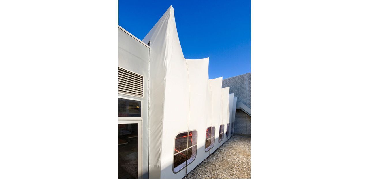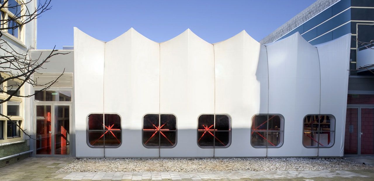 Architect Erik Meulenbelt has designed the temporary hall at a courtyard of the Domplein in Utrecht (the Netherlands). The base of the design is a red spaceframe, which has previously been used for a project in Japan (Osaka). This recycled spaceframe is covered with a double layered PVC tent-cloth. The new red and white structure is a perfect example of reusing industrial spaceframes.