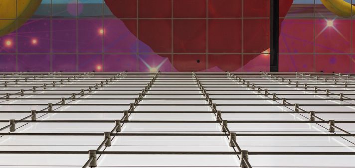The next step in the development of this technique is the flat tensioned cable-net glazed facade. The underlying concept here involves tensioned cables running between the upper and lower structure. The glass is suspended from these by clamps. As well as the weight of the glass, the cables must also transfer the wind loading to the surrounding structure. This is made possible by the flexing of the cable. This flexing also gives rise to the structural depth required for the transfer of the wind loading. The same idea is exploited by tightrope walkers. The cables in the facade must be carefully pre-tensioned to prevent them deflecting too far in strong winds.