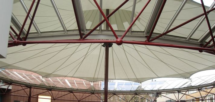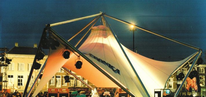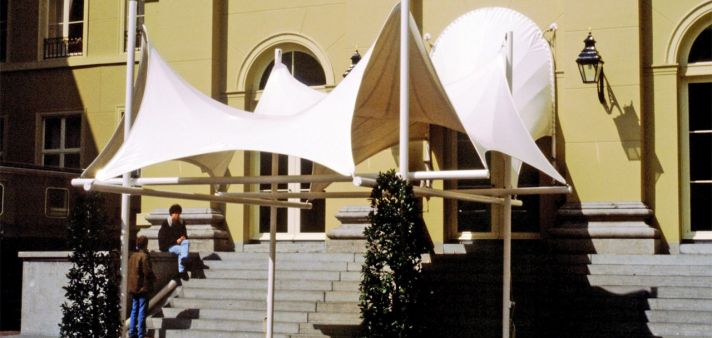 Tensioned membrane structures or “tents” in their architectonic and sculptural manifestations have been familiar since the 1960s work of Frei Otto of Stuttgart. The main use of the tent in the Netherlands has been as an “urban umbrella”, where the tent functions as a canopy, a shelter from the rain/sun or a freestanding roof, for example over a shopping centre. The most common form is a roof surface combining convex and concave curves. This arrangement allows the fibers in the reinforcement woven into the cloth to support one another as the wind loading fluctuates. Tensioned cables running with a concave or convex curve through the roof material, stiff compression members in steel tube or laminated timber, or steel masts to lift the membrane, reinforced if necessary with guy ropes, serve to maintain the so-called “anticlastic” form of the membrane with its opposing curves. The successful design of membrane structure calls for close collaboration between the project architect and construction contractor on the one hand and the product designer and the product manufacturer on the other, with a joint approach to the design right from the outset. Tensioned membranes are always special products. The direct influence of the dimensions of supporting and other structures in the vicinity mean that one design rarely duplicates another. In the Netherlands the smaller membranes generally use polyester-reinforced PVC fabric with a lifespan of fifteen to twenty years.