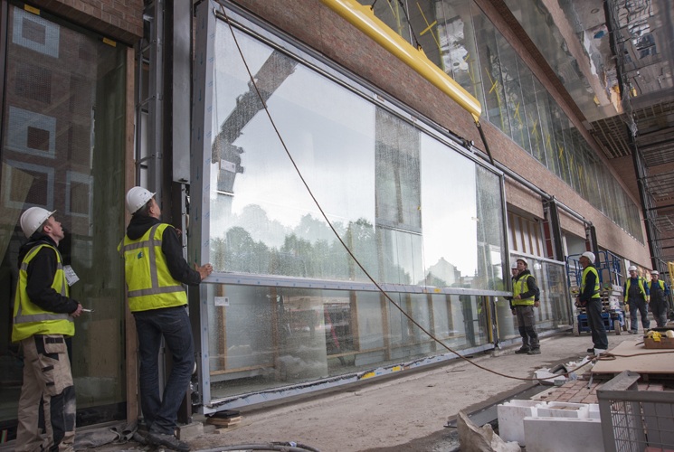 Voor de noordgevel van het nieuwe Centraal Station van Breda zijn vandaag drie zeer grote glazen hefpuien ingehesen. Het bewegende deel weegt ruim 1000 kilogram.