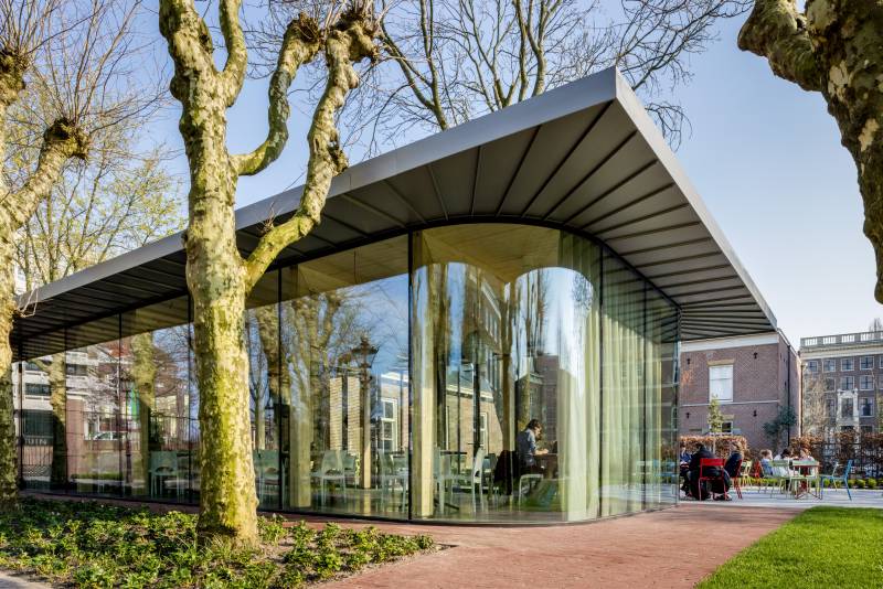Begin deze maand is in de Hoftuin naast Museum De Hermitage door de Stadsdeelvoorzitter Amsterdam Centrum een nieuwe theeschenkerij geopend. Het paviljoen heeft een houtconstructie en een volledig glazen gevel die rondom het gebouw loopt. Op de hoeken bevinden zich warmgebogen glaspanelen zodat er van binnenuit onbelemmerd zicht is op de stadstuin, die als het ware doorloopt in het interieur.