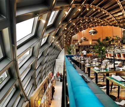 Het golvende dak van een winkelpassage in Tilburg wordt gedragen door een heel lichte staalconstructie die werkt als reciprocal frame.