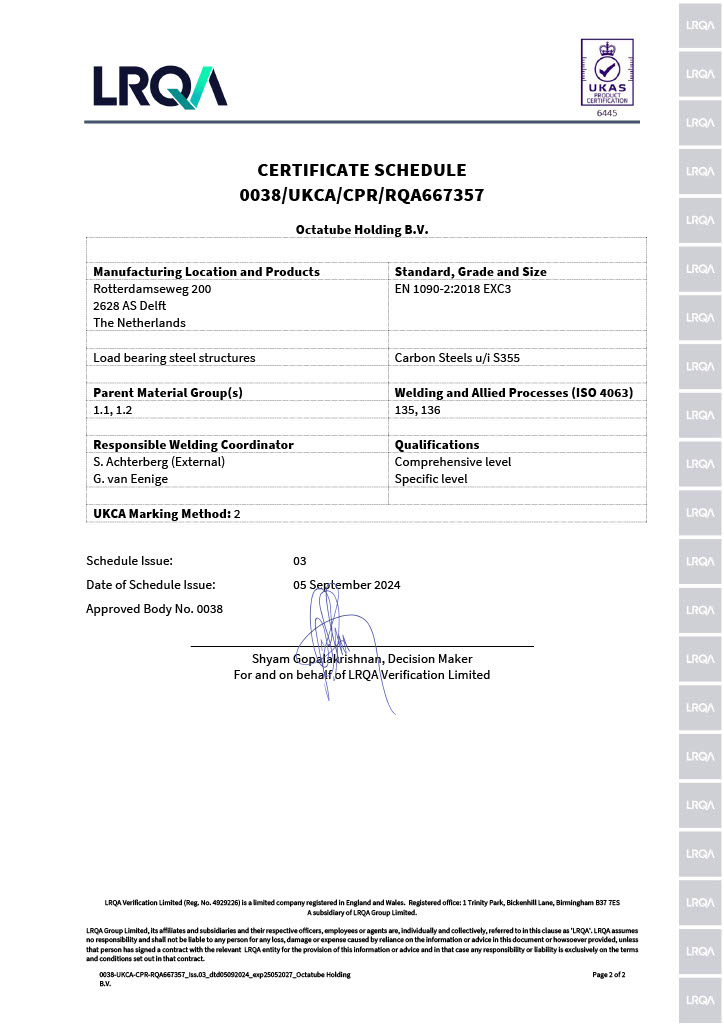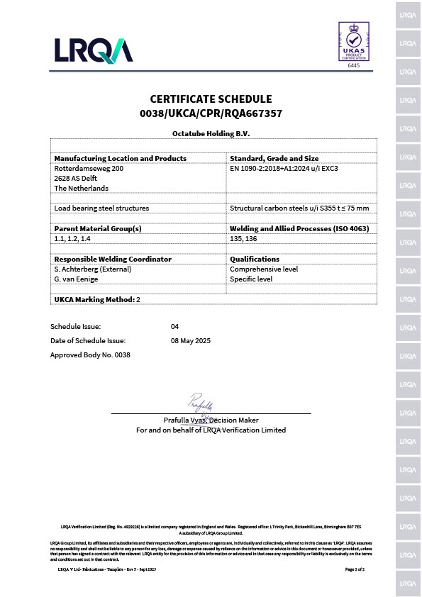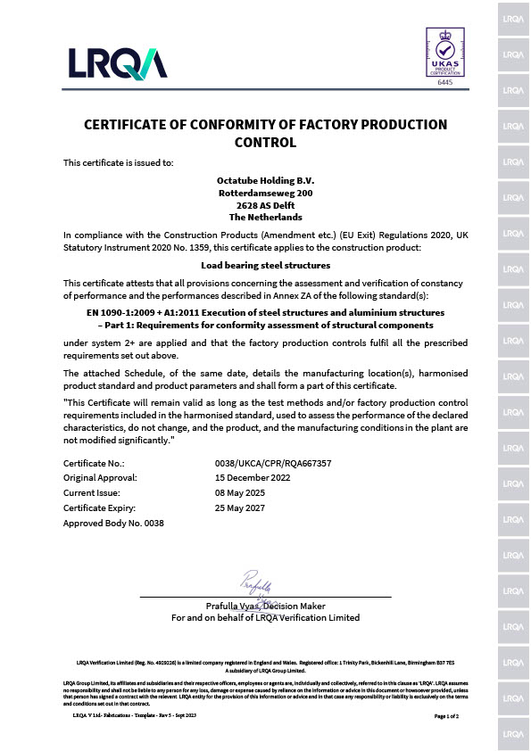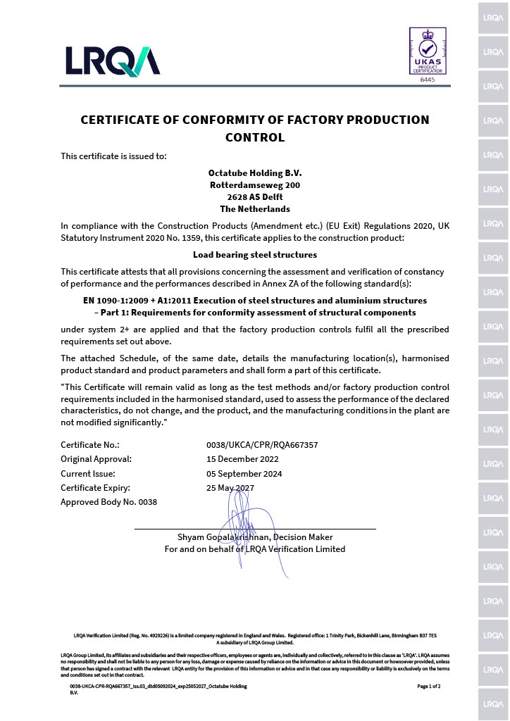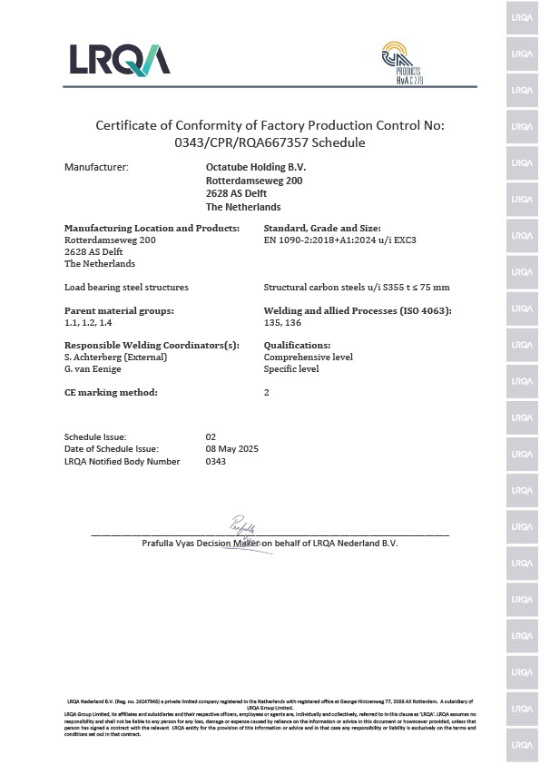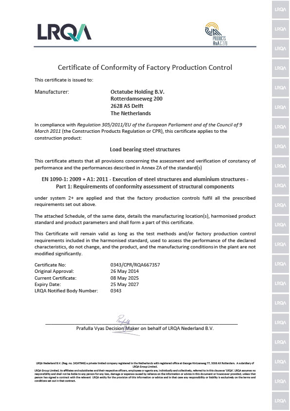 In NEN-EN 1090 staan de technische eisen voor staalconstructies. Vanaf 1 juli 2014 is certificering volgens de NEN-EN 1090-1 op dragende staalconstructies verplicht. Octatube is hiervoor gecertificeerd en voldoet aan de conformiteit van constructieve stalen onderdelen (CE-markering en UKCA-markering), uitvoeringsklasse EXC3.