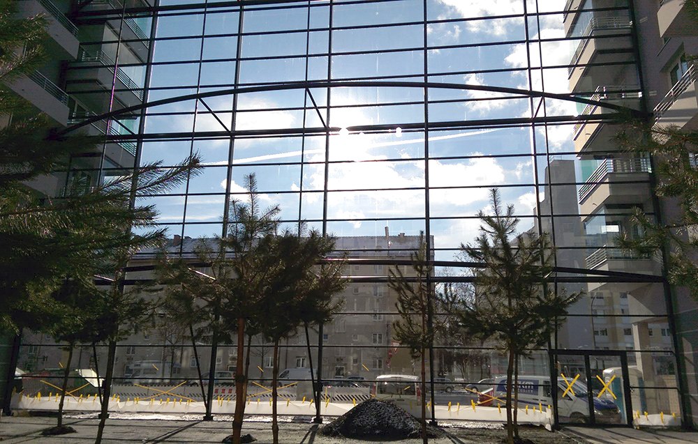 De montage van de grote glazen schuifdeuren, die de binnenplaatsen ontsluiten, vond plaats in de sneeuw.