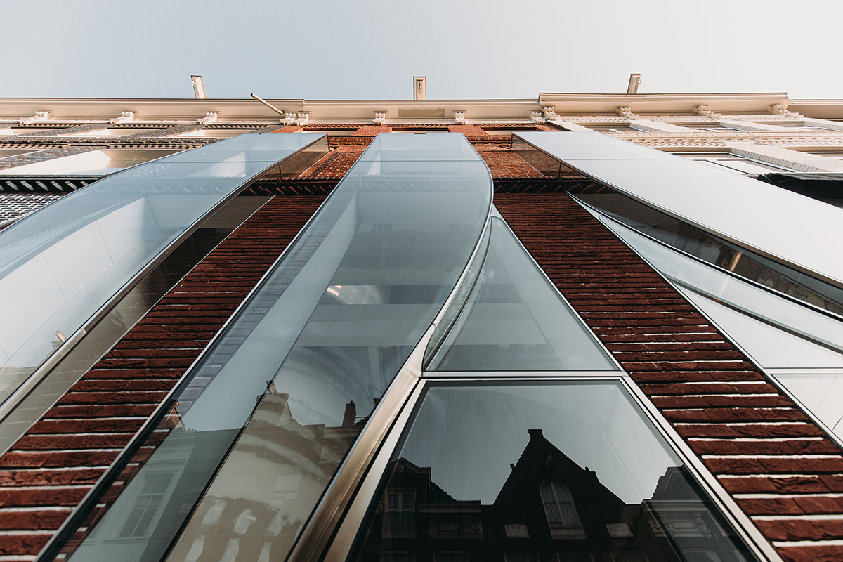 Aan de beroemde en meest exclusieve winkelstraat van Amsterdam, de P.C. Hooftstraat, staat een prachtig nieuwe gevel. De gevel van nummer 138 is voorzien van drie gebogen glazen boxen die vanaf de bovenste verdiepingen naar beneden lopen en lijken op golvende stukken stof. De glazen bozen beginnen evenwijdig aan de aangrenzende gevels en kragen naar boven toe uit naar buiten. Dat deze geleidelijke beweging zich binnen één vorm afspeelt, is bijzonder. Het straalt een soepelheid uit die je niet snel zou associëren met glas.