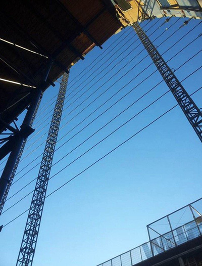 Medewerkers van Octatube zijn begonnen met de hoogste horizontale kabels, op ruim 30 meter hoogte. Aan één zijde worden de kabels in een stalen 'nestkastje' bevestigd, en aan de andere zijde door middel van een voorspanbrug. De kabels moeten namelijk nog met behulp van hydrauliek op voorspanning worden gebracht, waarbij de langste kabel onder 100% voorspanning circa 15 centimeter wordt uitgerekt. De voorspanning bedraagt ongeveer 300 kN per kabel. Momenteel hangen de kabels circa 700 milimeter door onder hun eigen gewicht. Dit is dezelfde vervorming die wordt toegestaan wanneer de gevels in gebruik zijn, tijdens extreme windkrachten.