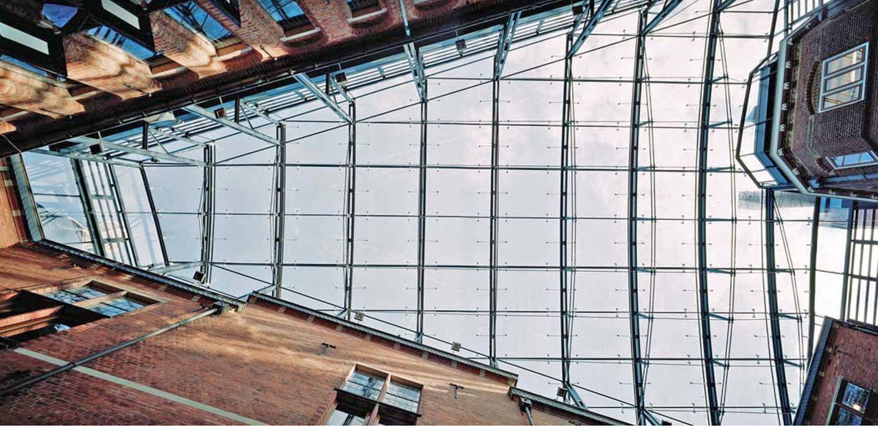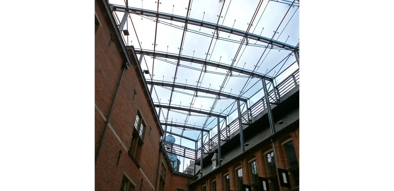 Een grote uitdaging voor de constructie waren de verschillende randaansluitingen op de bestaande daken. De constructie bestaat uit hoofdspanten waaraan uitkragende stalen zwaarden zijn gemonteerd. Hiermee wordt de glasoverspanning verkleind van 2,7 naar 1,9 meter, terwijl de glasmaat wel 2,7 meter blijft. Hierdoor is de hoeveelheid staalconstructie op een efficiënte manier geminimaliseerd.