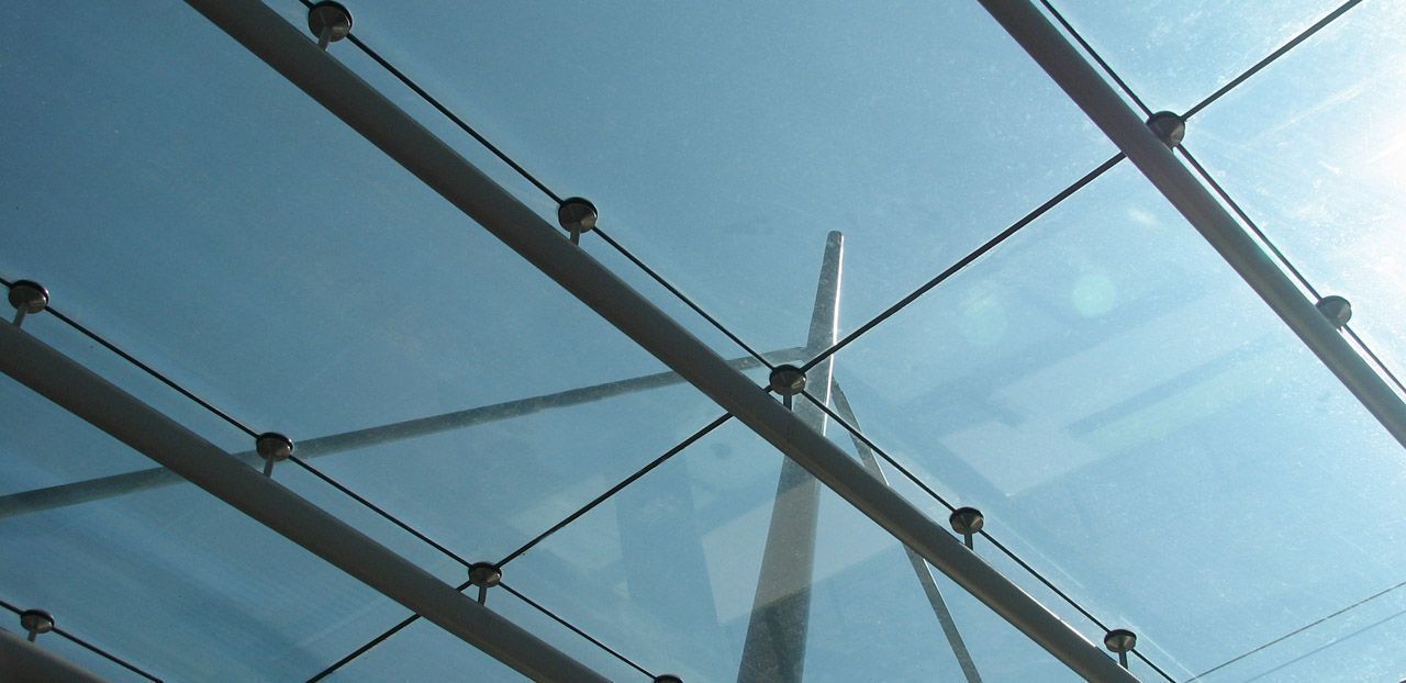 De glaspanelen zijn volledig voorgespannen en gelamineerd, en hebben een groenige kleur.