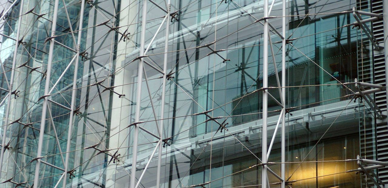 In de kozijnloze gevel van Finsbury Pavement volgen de glaspanelen van 2,1 meter bij 4,2 meter in geknikte vorm de kwartcirkel van de plattegrond. De hoofdstabilisering wordt bereikt door middel van verticaal geplaatste vakwerkliggers van ronde buizen die hangend aan het dak zijn bevestigd en aan de onderzijde zijn verbonden met een veelhoekig horizontaal spant. Aan deze spanten zijn gegoten roestvrij stalen Quattro-knopen bevestigd met een stelsel van horizontale, diagonale en verticale roestvrij stalen tuien, die door de rondlopende plattegrond een horizontale druk op de spanten uitoefenen en de gehele constructie voorspannen.