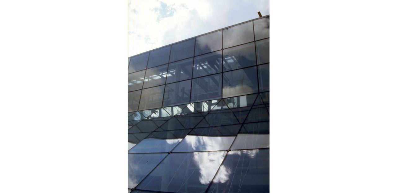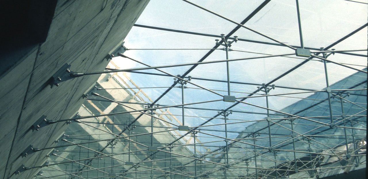 De structurele gevel is opgebouwd uit grote glaspanelen die via Quattro's aan een slanke achterconstructie van kabels en staven is bevestigd.