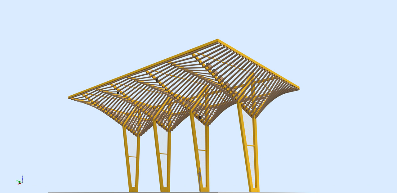 De stalen liggers van het dak zijn met de kolommen verbonden door middel van druk- en trekstangen en trekarmen met dezelfde doorsnede als de liggers. De houten elementen, die door de staalconstructie worden gedragen, hebben geen structurele functie. In de constructie hebben we ook lampen geïntegreerd. Aan de bovenkant van de overkapping komen vogel- en vleermuiskasten.