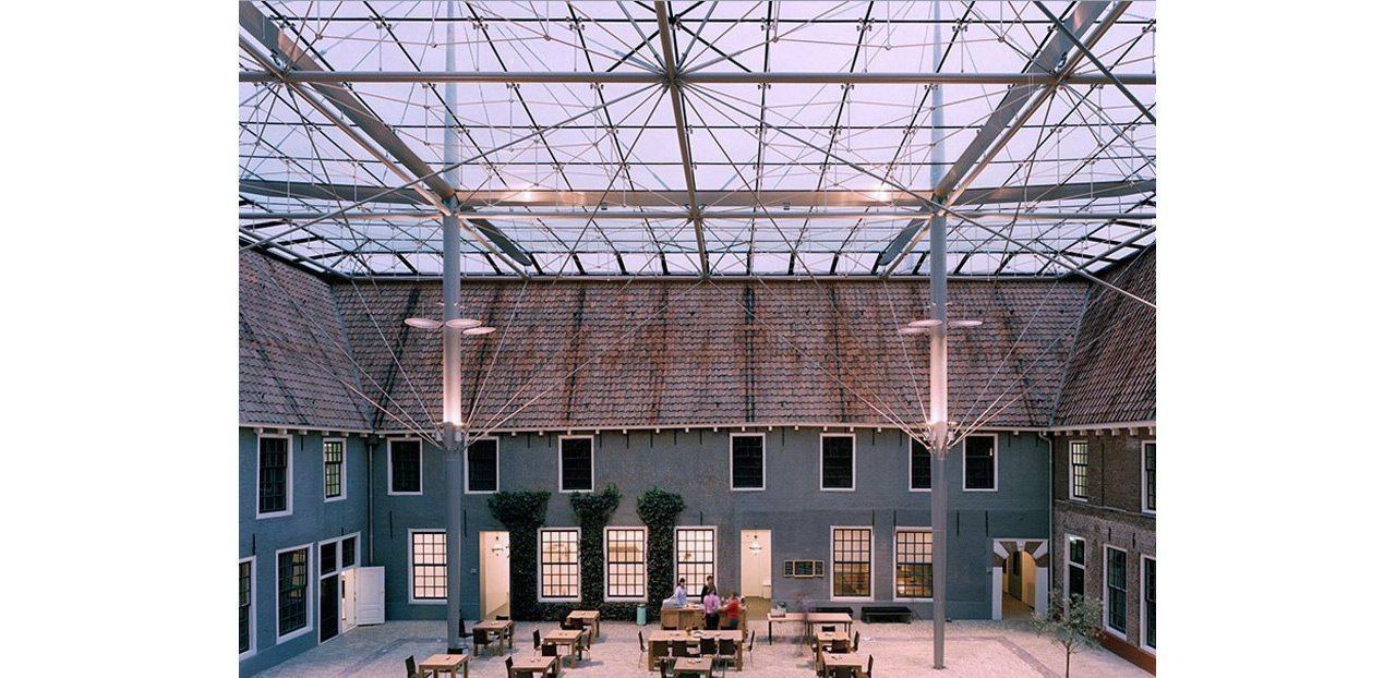 Het glazen dak boven de binnenplaats van het Fries Natuurhistorisch Museum in Leeuwarden wordt volledig onafhankelijk van de bestaande historische bebouwing gedragen door vier centrale mastvormige kolommen van negentien meter lengte. De binnenplaats wordt multifunctioneel gebruikt en heeft met het glazen dak een majestueus karakter gekregen. Het contrast tussen oud en nieuw verhoogt de architectonische waarde van zowel de historische panden als de dakconstructie.