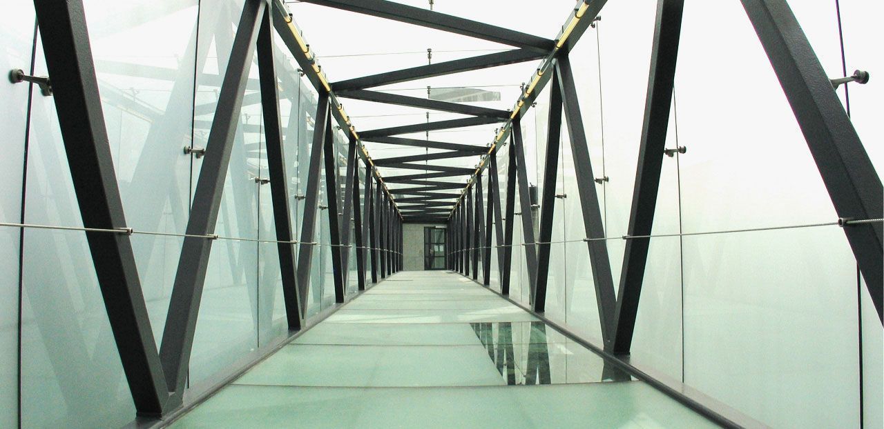 Zowel de wanden, als het dak en de vloer zijn van glas. De glaspanelen zijn voorzien van een witte translucente, ceramische screening.  De glazen vloerpanelen zijn ook nog voorzien van een antislip laag. Op een aantal plaatsen kan naar buiten worden gekeken.