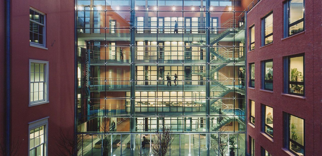 Het kantoor van Price Waterhouse Coopers aan de Lange Voorhout in Den Haag is gevestigd in een Rijksmonument. In het verlengde van een monumentale entreehal bevindt zich een groot modern atrium, dat oud en nieuw met elkaar verbindt. “Je betreedt de 21ste eeuw”, aldus de architect van de Architektenkombinatie.
