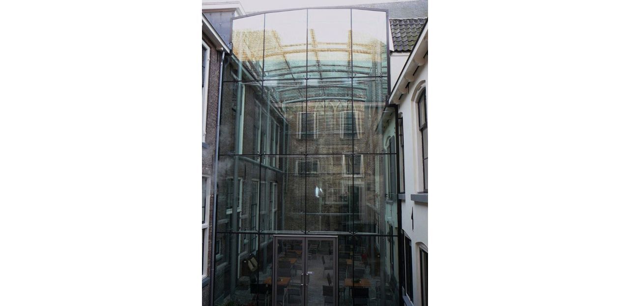 Het 9,5 meter hoge atrium, dat in feite ook als nieuwe entree voor het museum fungeert, heeft een glazen dak van 6 bij 9 meter. De hoofddraagconstructie staat vrij van de omliggende gebouwen, waardoor geen krachten hoeven te worden afgedragen naar de historische bebouwing. De constructie bestaat uit drie portalen die onderling gekoppeld zijn. De liggers van de portalen zijn gewalst om de gewenste vorm te krijgen. De glaspanelen zijn bevestigd aan horizontale lensvormige spanten door middel van roestvrij stalen Quattro knopen.